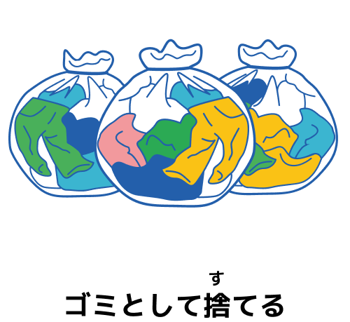ヨーロッパの国では、着なくなった衣類をリユース(くり返し使う)したり、リサイクル(資源として生まれ変わらせる)したりすることが、日本よりももっと盛んに行われています。 しかし日本では、まだ着られるきれいな衣類もたくさん捨てられていて、その多くがそのまま燃やされたり地面に埋められたりしてしまっているのです。